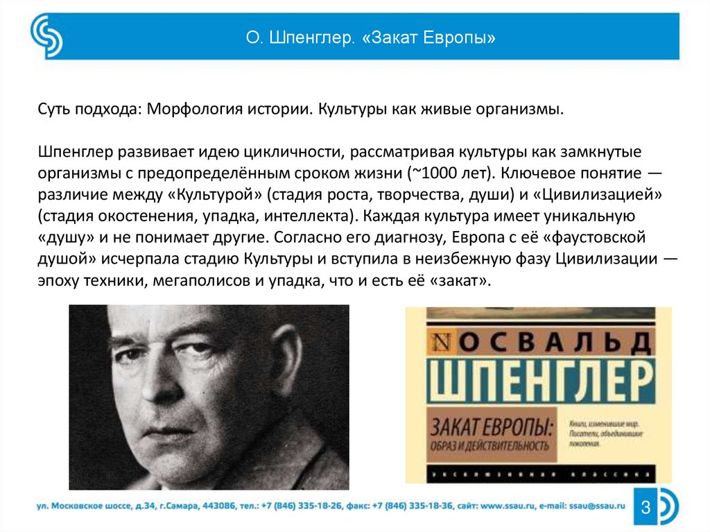 О. Шпенглер. «Закат Европы»Суть подхода: Морфология истории. Культуры как живые организмы.