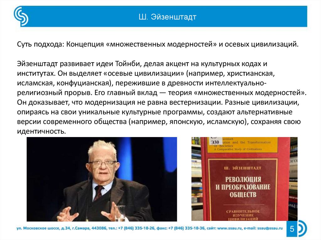 исламская, конфуцианская), пережившие в древности интеллектуальнорелигиозный прорыв. Его главный вклад — теория «множественных модерностей».