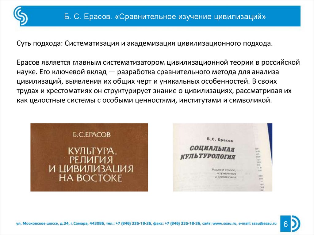 Б. С. Ерасов. «Сравнительное изучение цивилизаций»Суть подхода: Систематизация и академизация цивилизационного подхода.