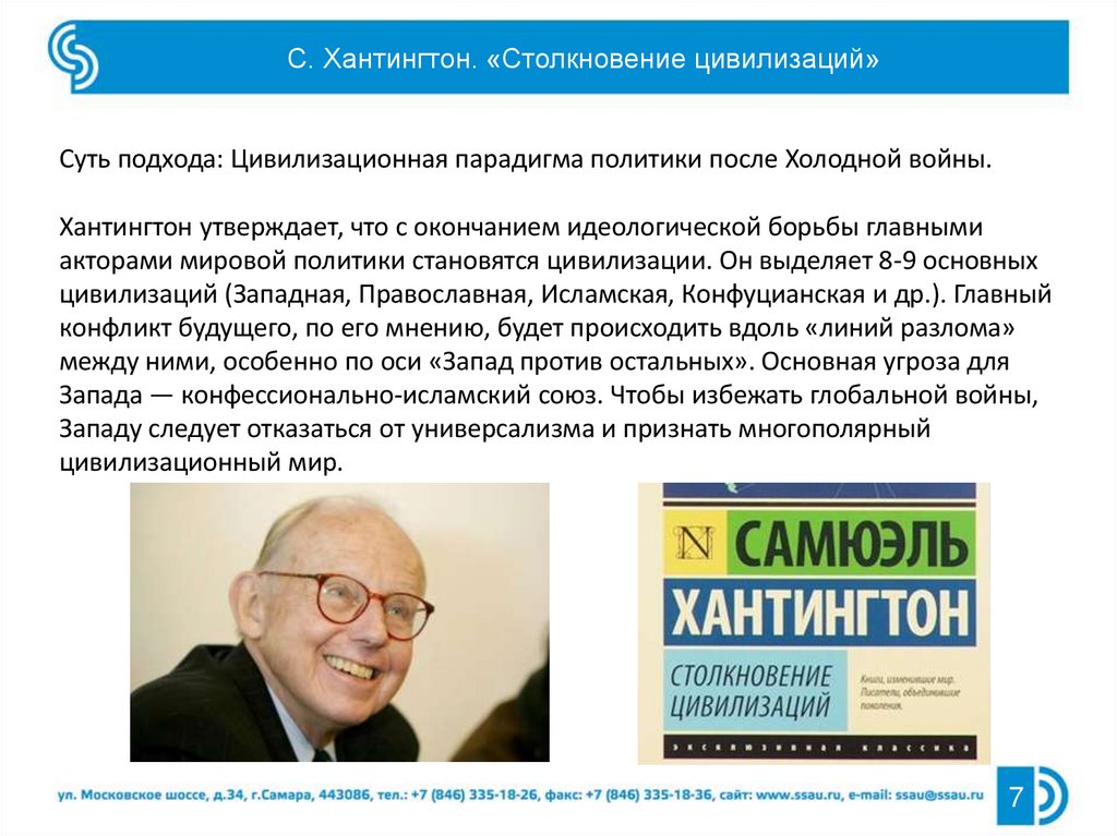 С. Хантингтон. «Столкновение цивилизаций»Суть подхода: Цивилизационная парадигма политики после Холодной войны.