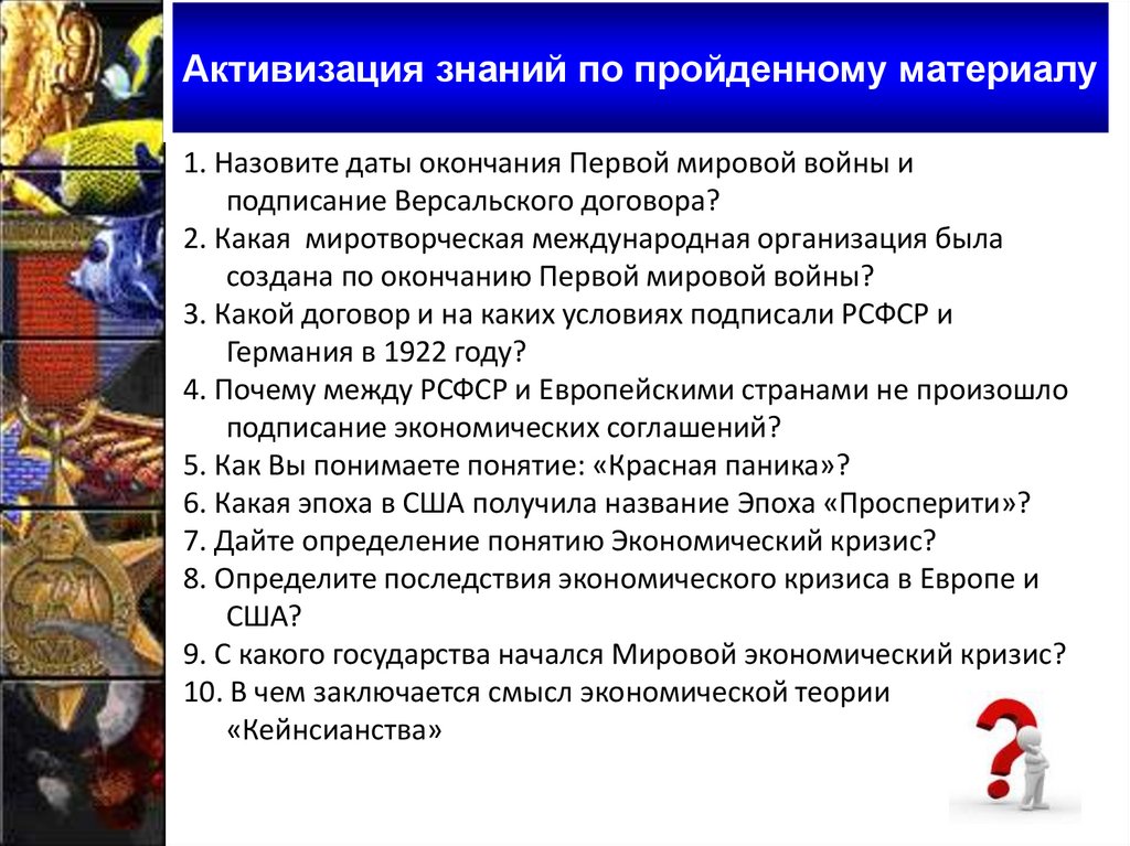 Активизация знаний по пройденному материалу1. Назовите даты окончания Первой мировой войны и