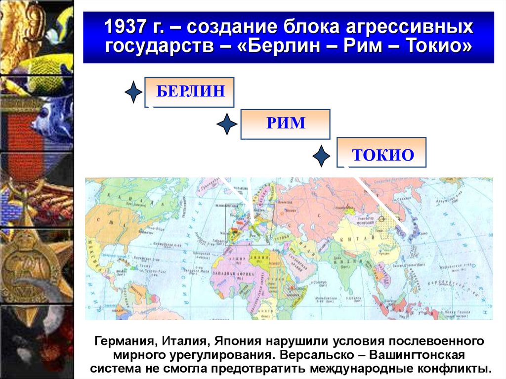 Германия, Италия и Япония, вставшие на путь агрессии, заключили междусобой военно-политические договорённости.