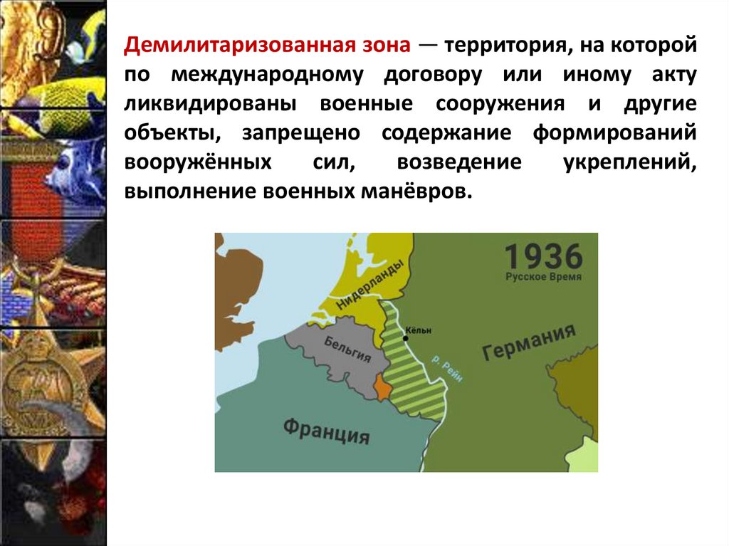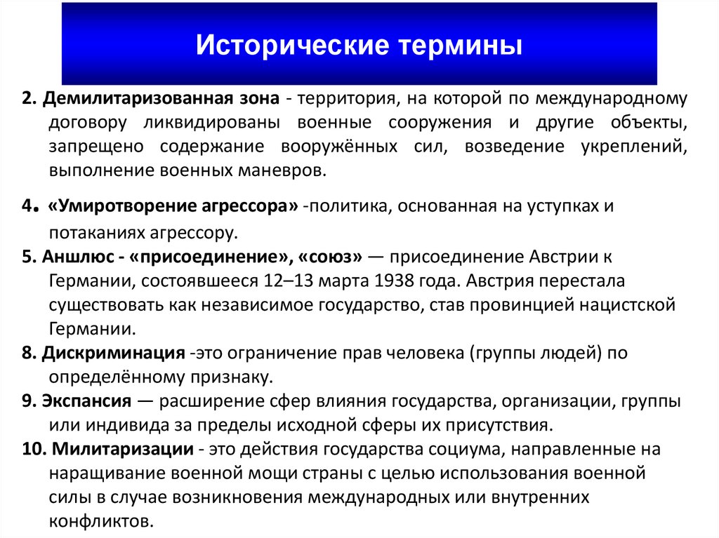 Исторические термины2. Демилитаризованная зона - территория, на которой по международному