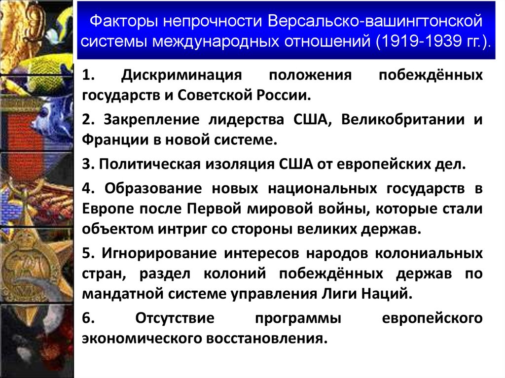 Факторы непрочности Версальско-вашингтонскойсистемы международных отношений (1919-1939 гг.).