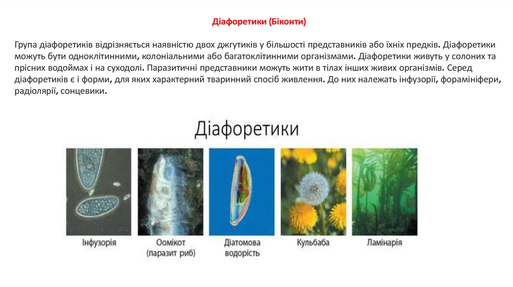 Діафоретики (Біконти)Група діафоретиків відрізняється наявністю двох джгутиків у більшості представників або їхніх предків. Діафоретики