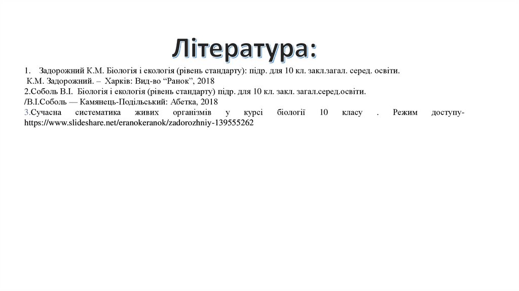 1. Задорожний К.М. Біологія і екологія (рівень стандарту): підр. для 10 кл. закл.загал. серед. освіти.К.М. Задорожний. – Харків: Вид-во “Ранок”, 2018