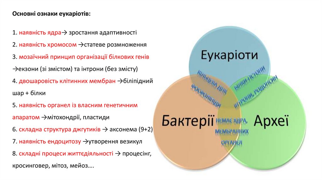Основні ознаки еукаріотів:1. наявність ядра→ зростання адаптивності