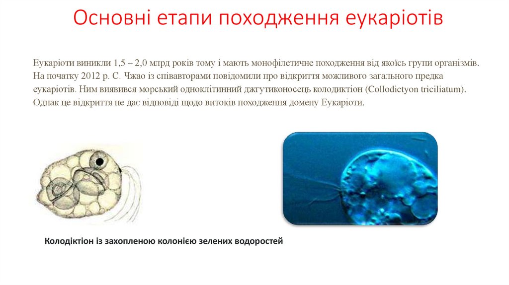 Основні етапи походження еукаріотівЕукаріоти виникли 1,5 – 2,0 млрд років тому і мають монофілетичне походження від якоїсь групи організмів.