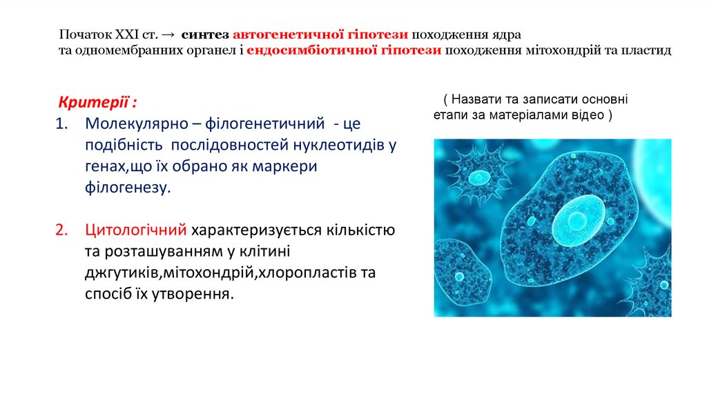 Початок XXI ст. → синтез автогенетичної гіпотези походження ядрата одномембранних органел і ендосимбіотичної гіпотези походження мітохондрій та пластид