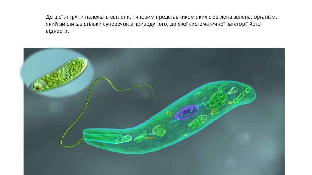 До цієї ж групи належать евглени, типовим представником яких є евглена зелена, організм,який викликав стільки суперечок з приводу того, до якої систематичної категорії його
