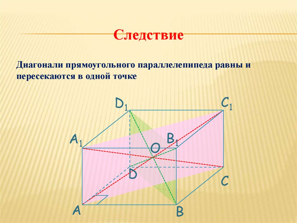 СледствиеДиагонали прямоугольного параллелепипеда равны и