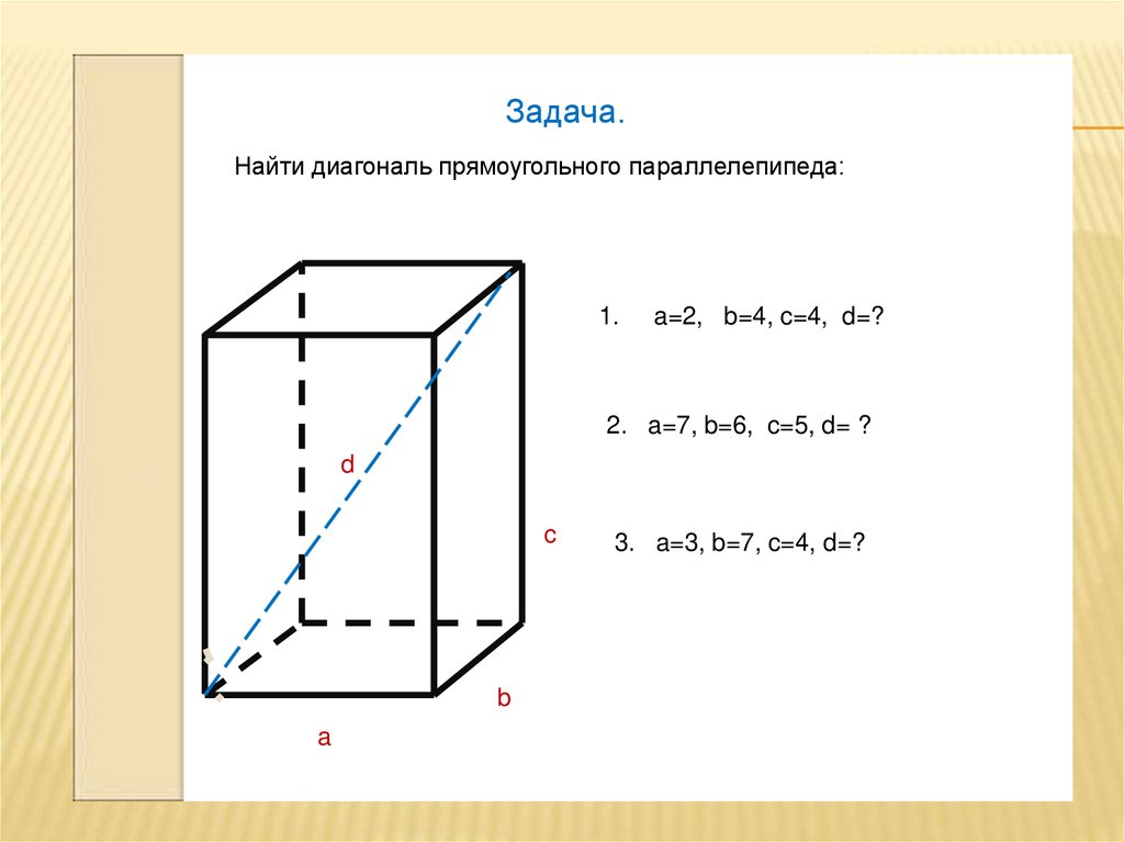 Задача.Найти диагональ прямоугольного параллелепипеда: