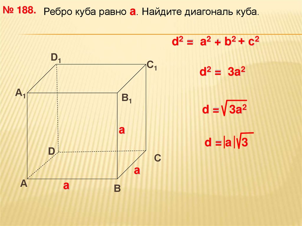 № 188. Ребро куба равно а. Найдите диагональ куба.d2 = a2 + b2 + с2