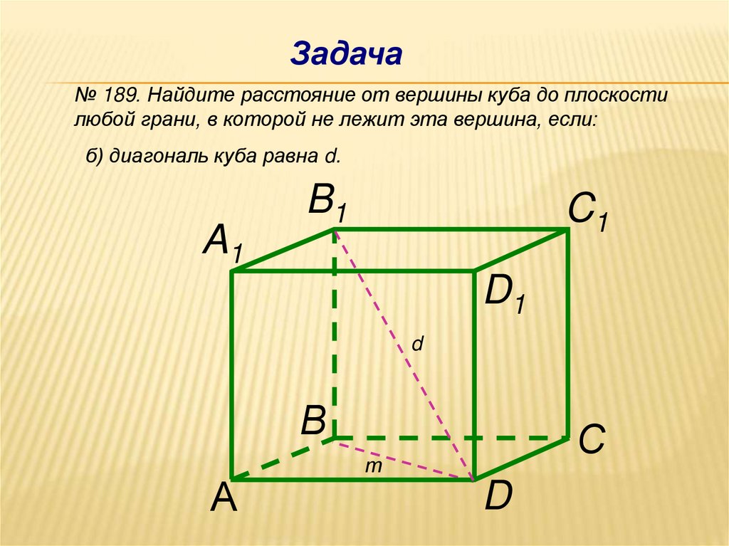 Задача№ 189. Найдите расстояние от вершины куба до плоскости