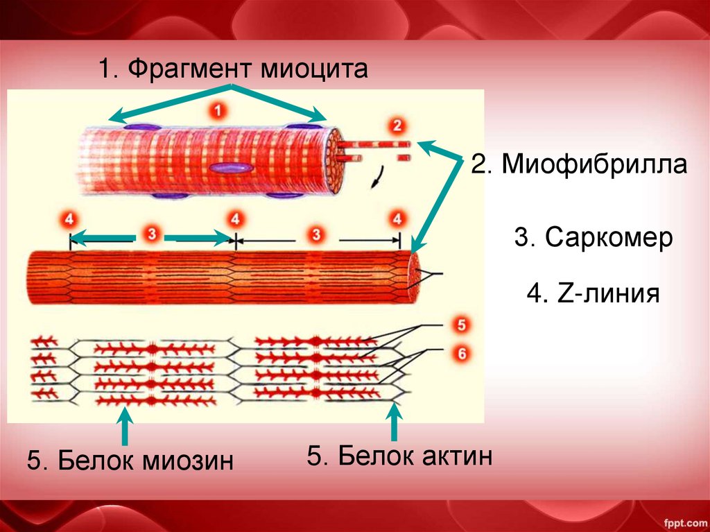 • 4. Сократимые белки в миофибриллахстрого чередуются,
