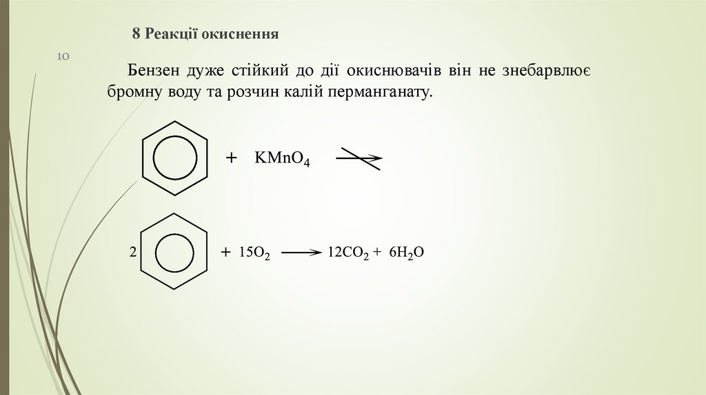 Бензен дуже стійкий до дії окиснювачів він не знебарвлює