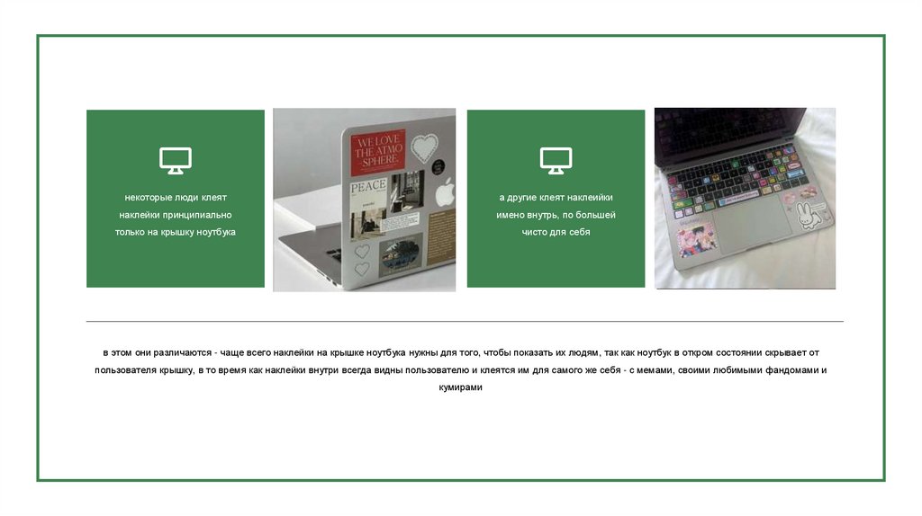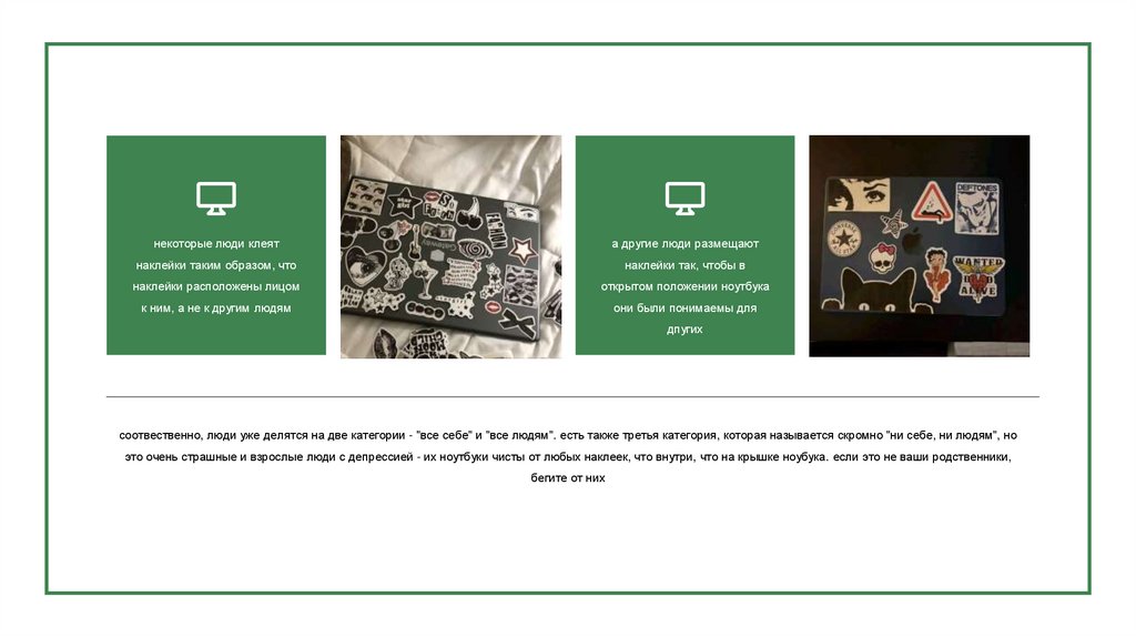 пользователя крышку, в то время как наклейки внутри всегда видны пользователю и клеятся им для самого же себя - с мемами, своими любимыми фандомами и