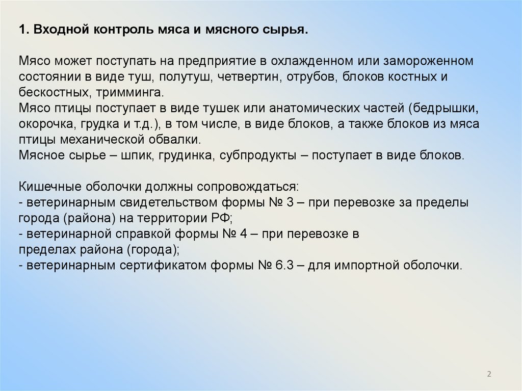 1. Входной контроль мяса и мясного сырья.Мясо может поступать на предприятие в охлажденном или замороженном
