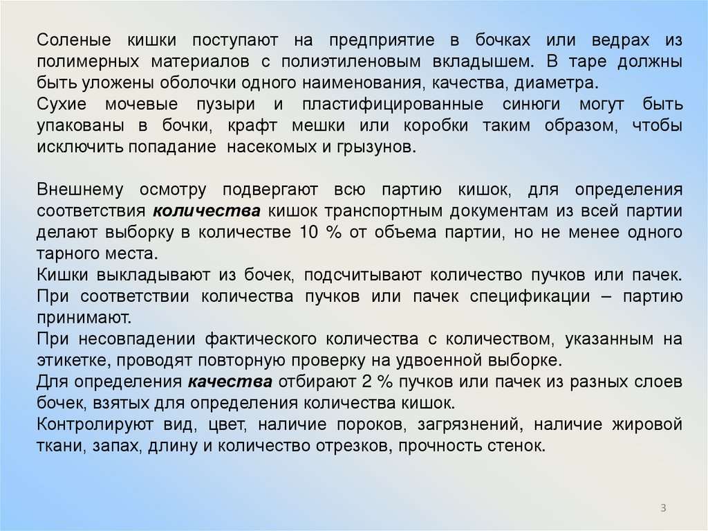 Соленые кишки поступают на предприятие в бочках или ведрах изполимерных материалов с полиэтиленовым вкладышем. В таре должны