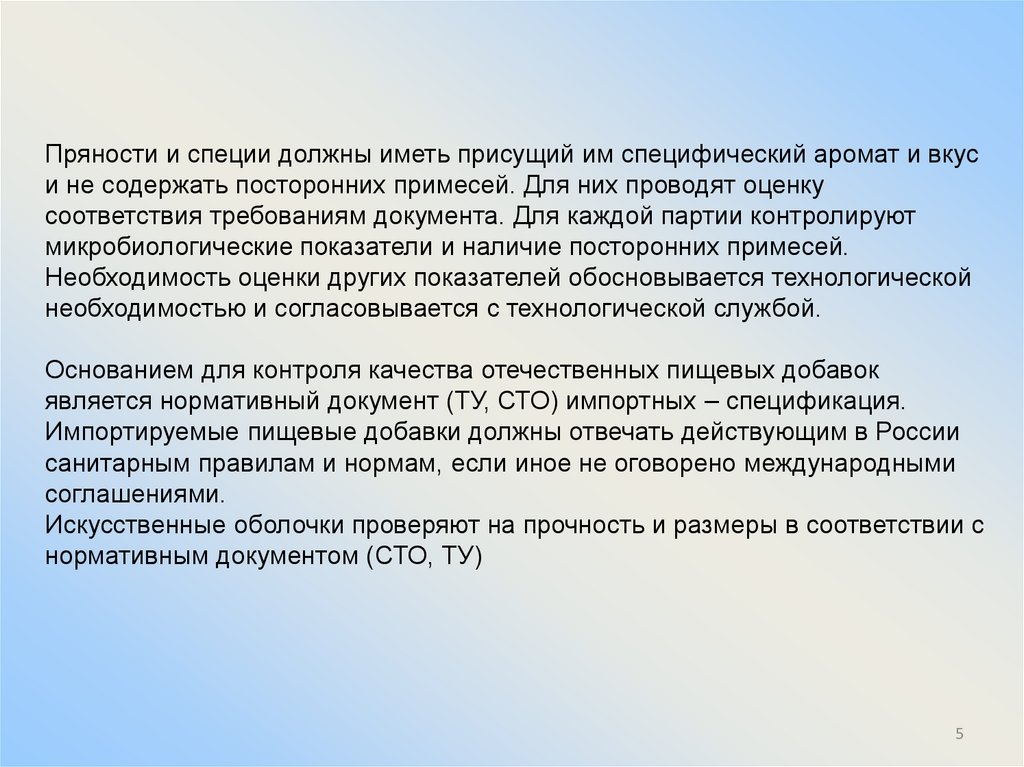 Пряности и специи должны иметь присущий им специфический аромат и вкуси не содержать посторонних примесей. Для них проводят оценку