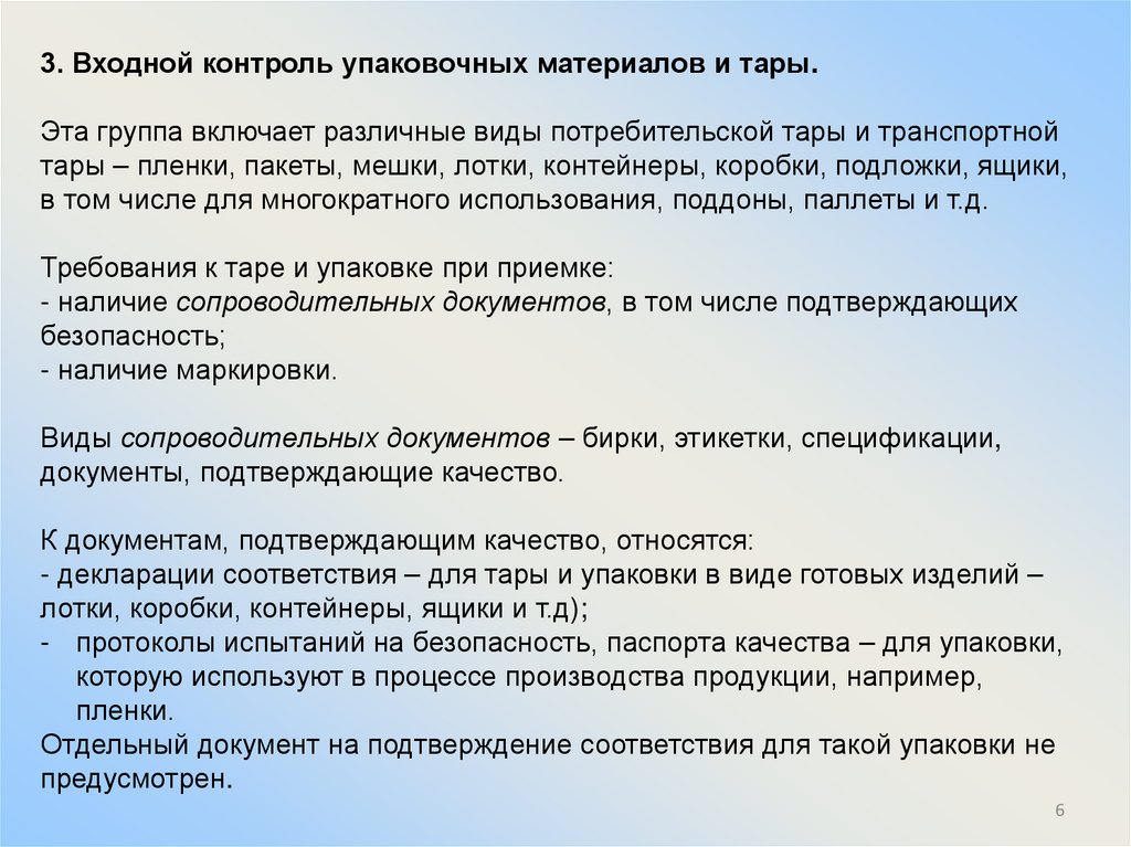3. Входной контроль упаковочных материалов и тары.Эта группа включает различные виды потребительской тары и транспортной