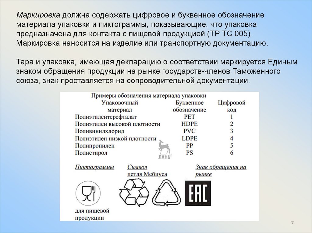 Маркировка должна содержать цифровое и буквенное обозначениематериала упаковки и пиктограммы, показывающие, что упаковка