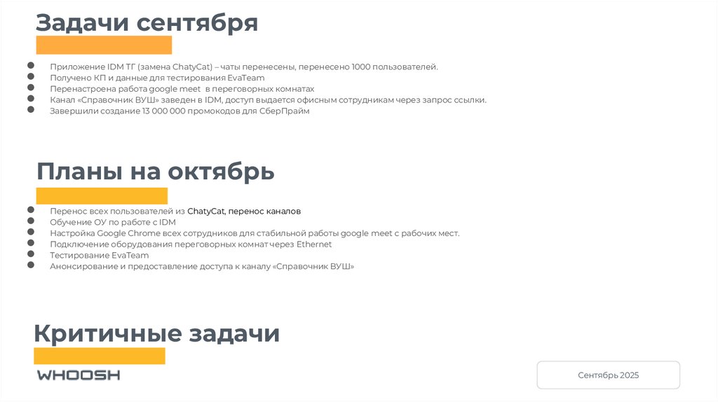 Задачи сентябряПриложение IDM ТГ (замена ChatyCat) – чаты перенесены, перенесено 1000 пользователей.
