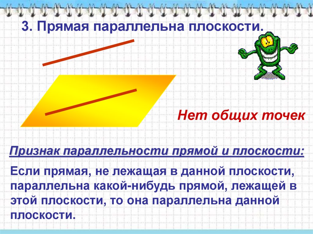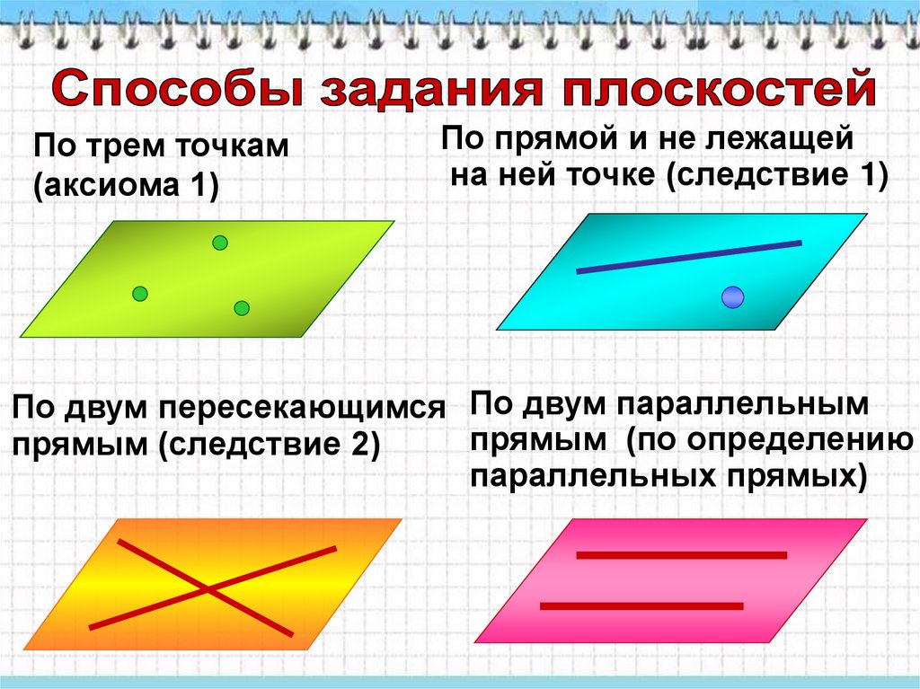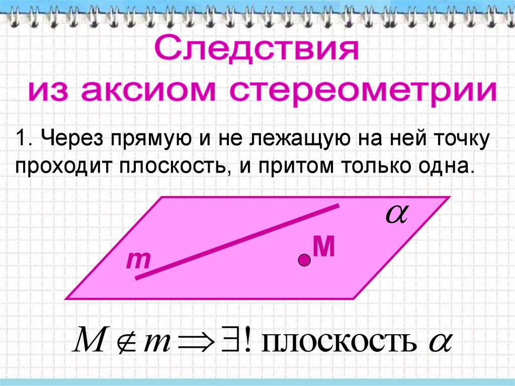1. Через прямую и не лежащую на ней точкупроходит плоскость, и притом только одна.