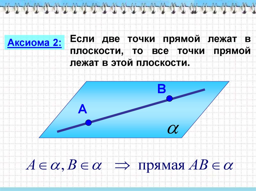 Аксиома 2: Если две точки прямой лежат вплоскости, то все точки прямой