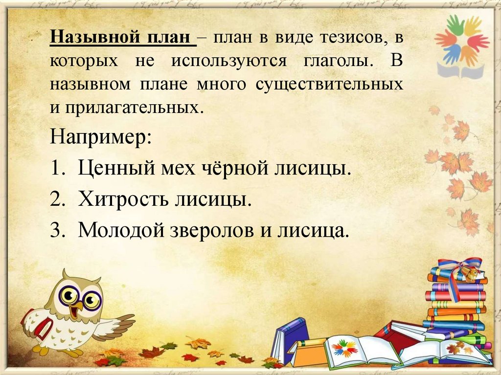 Назывной план – план в виде тезисов, вкоторых не используются глаголы. В