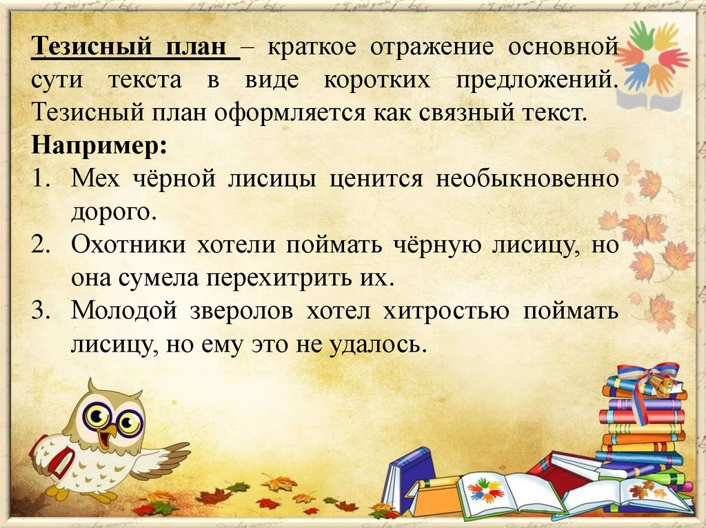 Тезисный план – краткое отражение основнойсути текста в виде коротких предложений.