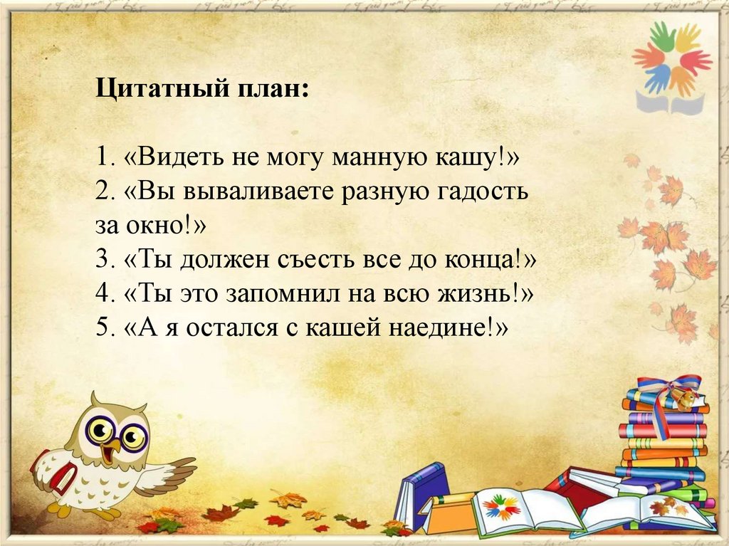 Цитатный план:1. «Видеть не могу манную кашу!»