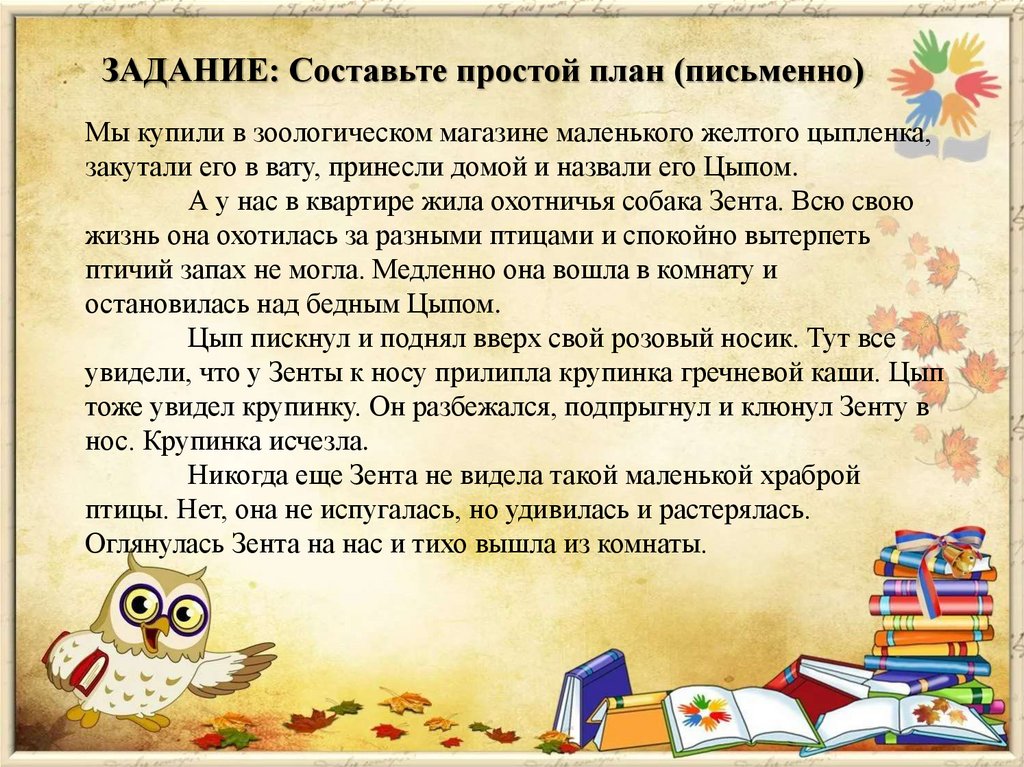 ЗАДАНИЕ: Составьте простой план (письменно)Мы купили в зоологическом магазине маленького желтого цыпленка,
