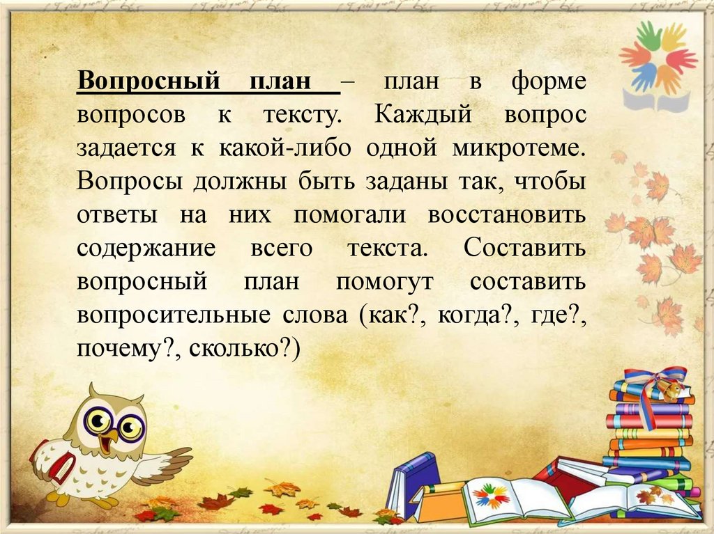Вопросный план – план в формевопросов к тексту. Каждый вопрос