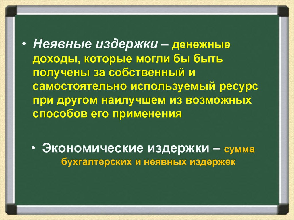 • Неявные издержки – денежныедоходы, которые могли бы быть