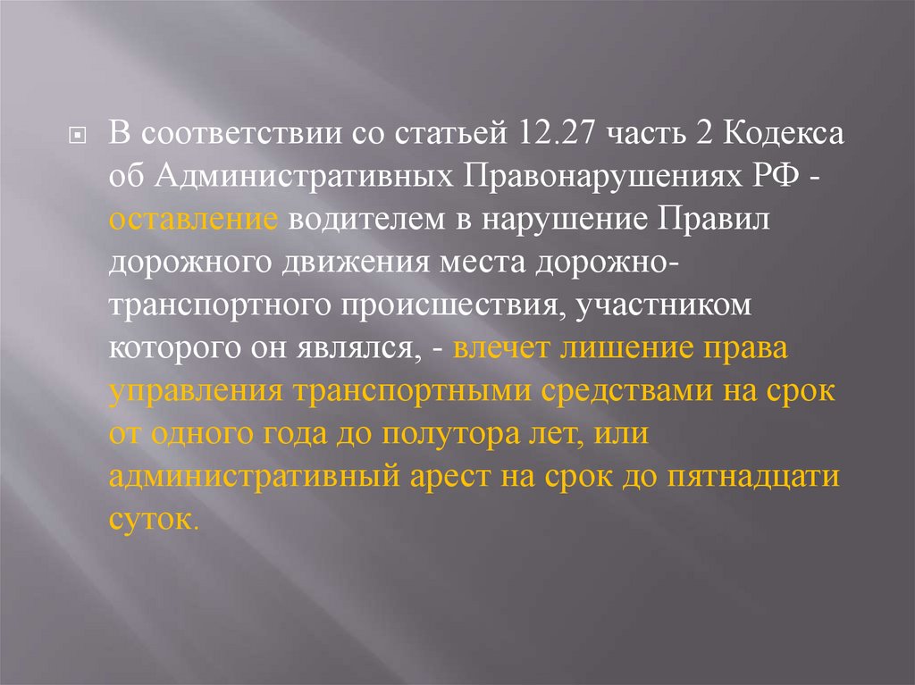 В соответствии со статьей 12.27 часть 2 Кодексаоб Административных Правонарушениях РФ оставление водителем в нарушение Правил