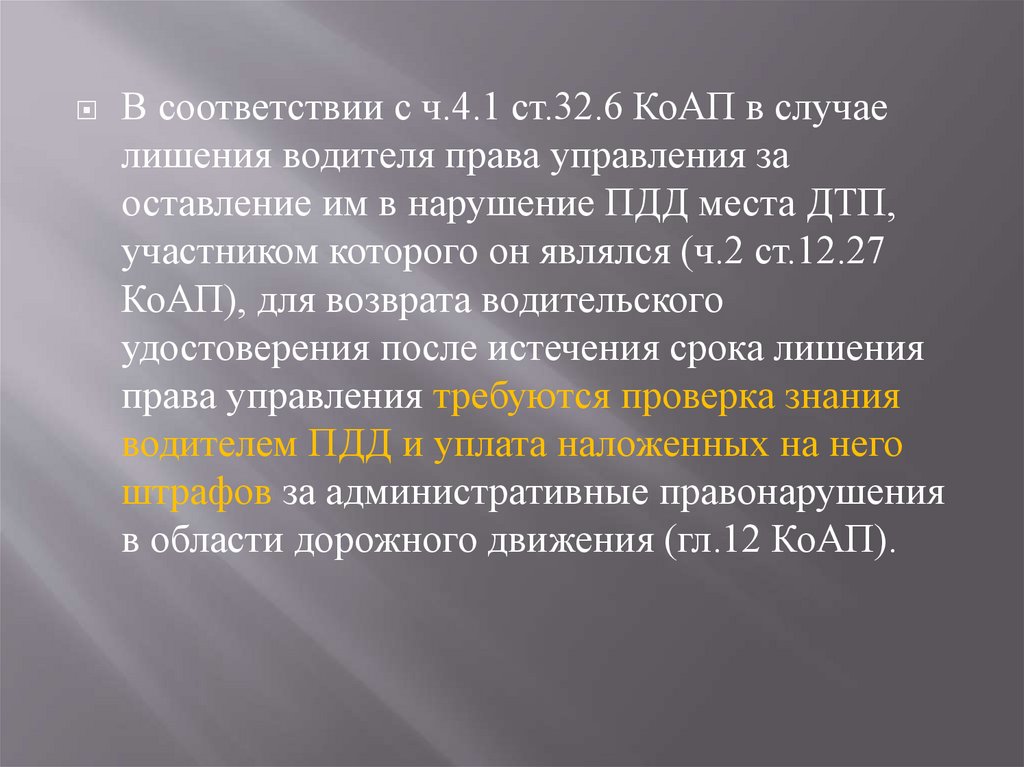 В соответствии с ч.4.1 ст.32.6 КоАП в случаелишения водителя права управления за