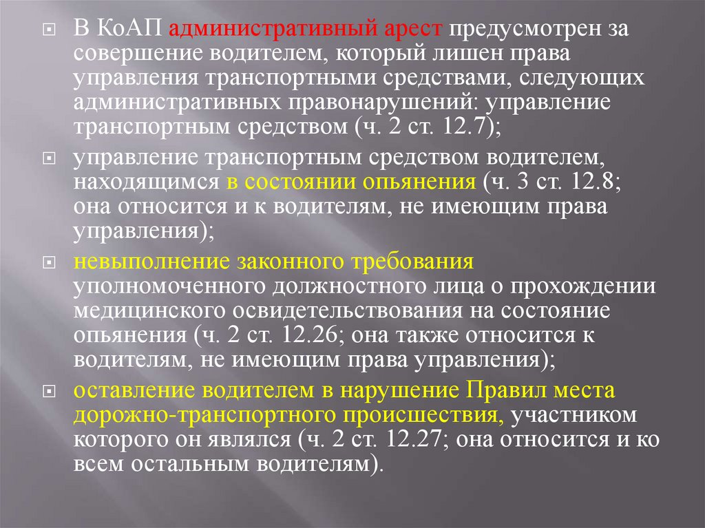 В КоАП административный арест предусмотрен засовершение водителем, который лишен права