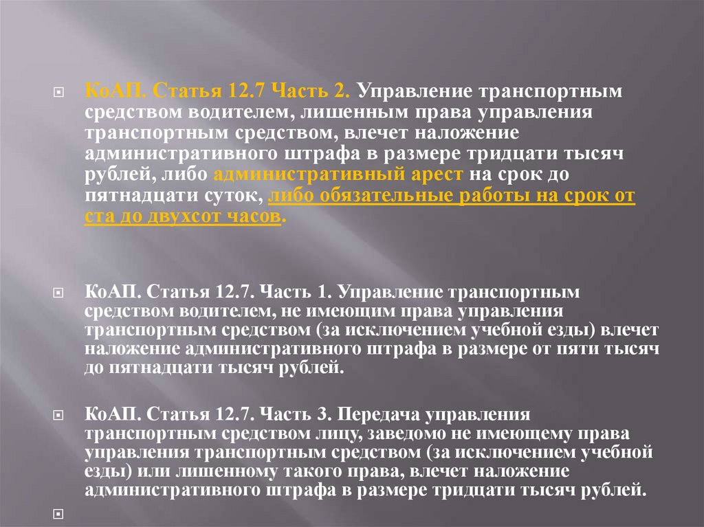 КоАП. Статья 12.7 Часть 2. Управление транспортнымсредством водителем, лишенным права управления