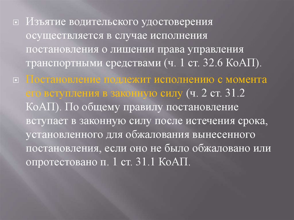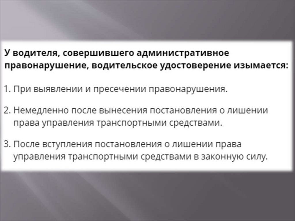 Изъятие водительского удостоверенияосуществляется в случае исполнения