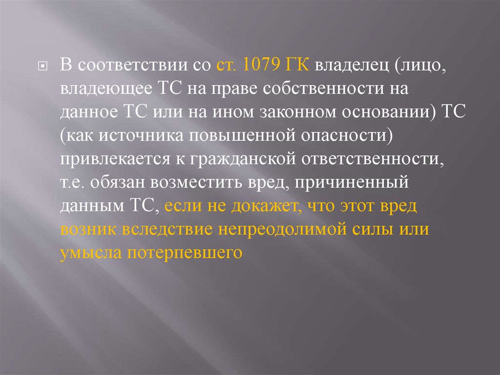 В соответствии со ст. 1079 ГК владелец (лицо,владеющее ТС на праве собственности на
