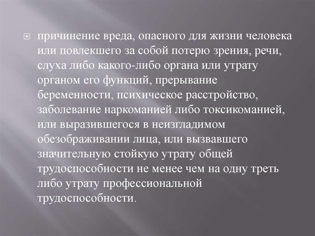 причинение вреда, опасного для жизни человекаили повлекшего за собой потерю зрения, речи,