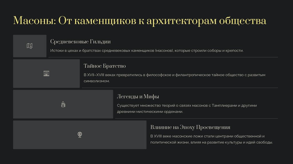 Истоки в цехах и братствах средневековых каменщиков (масонов), которые строили соборы и крепости.