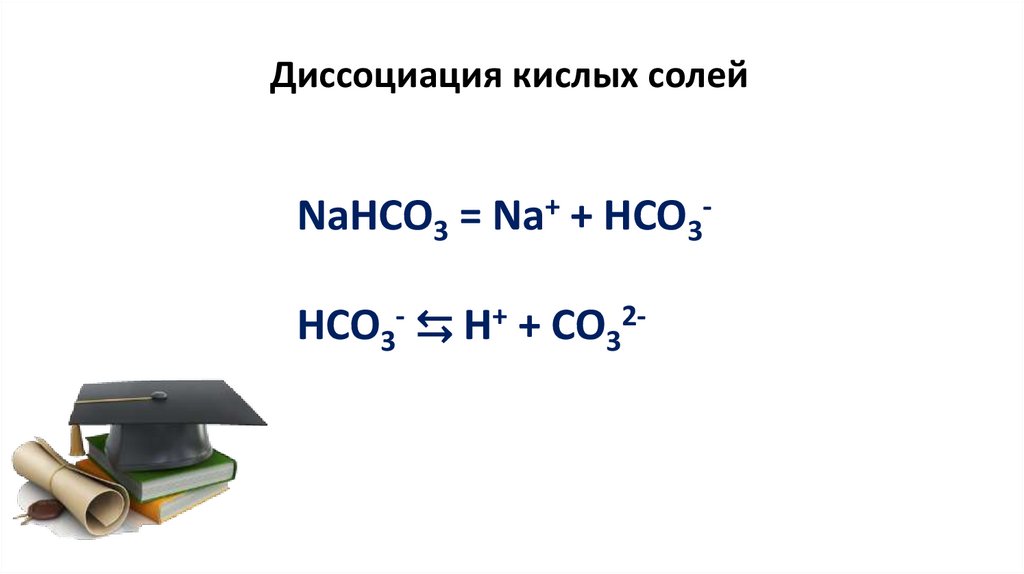 Диссоциация кислых солейNaHCO3 = Na+ + HCO3HCO3- ⇆ H+ + CO32-