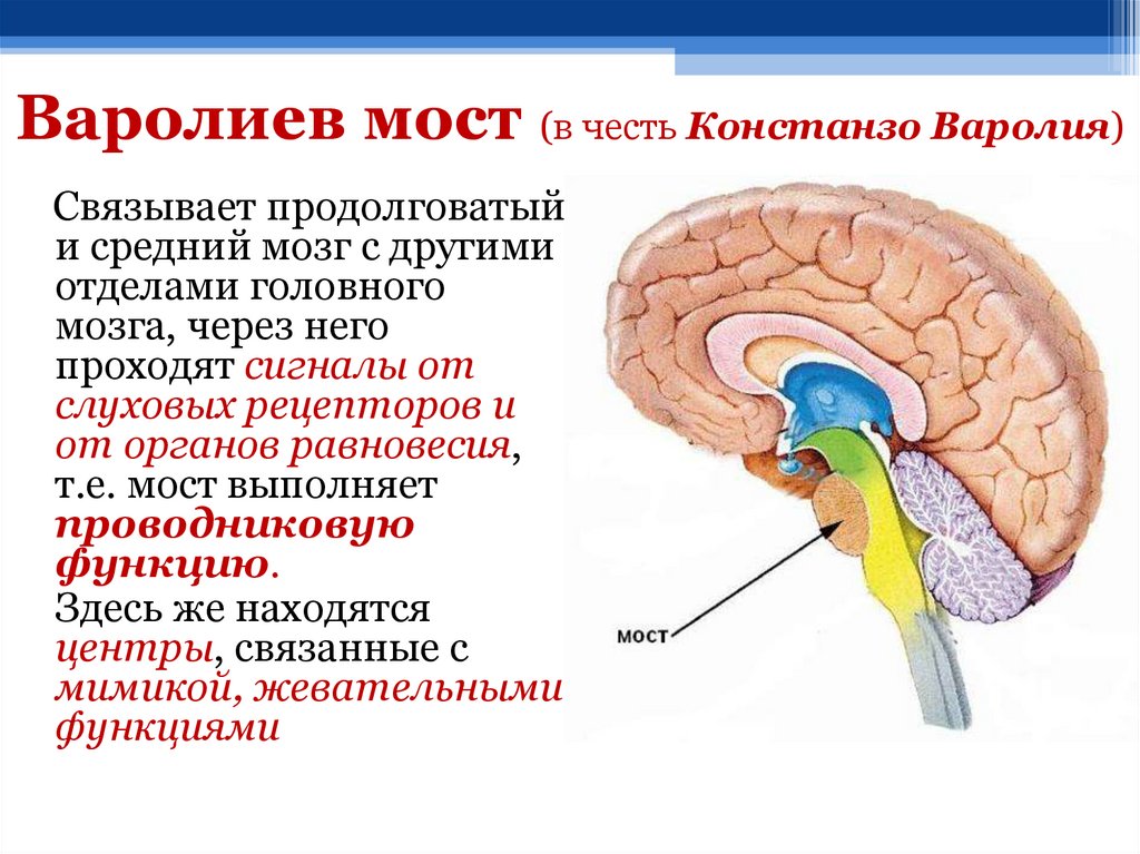 Варолиев мост (в честь Констанзо Варолия)Связывает продолговатый