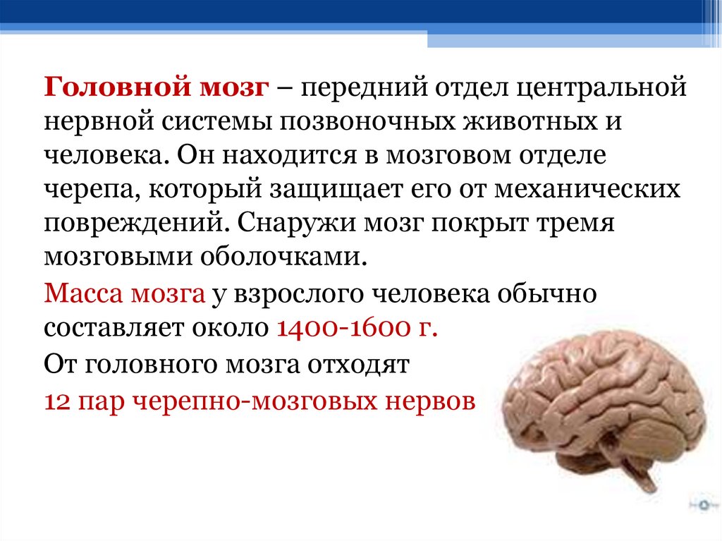 Головной мозг – передний отдел центральнойнервной системы позвоночных животных и