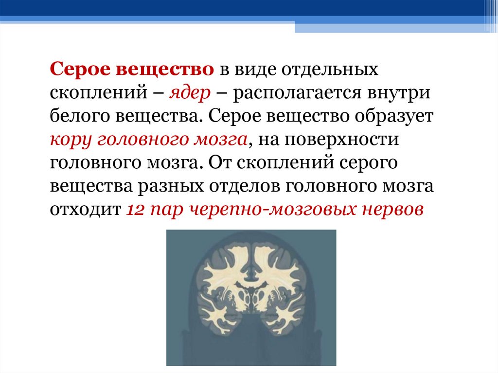 Серое вещество в виде отдельныхскоплений – ядер – располагается внутри