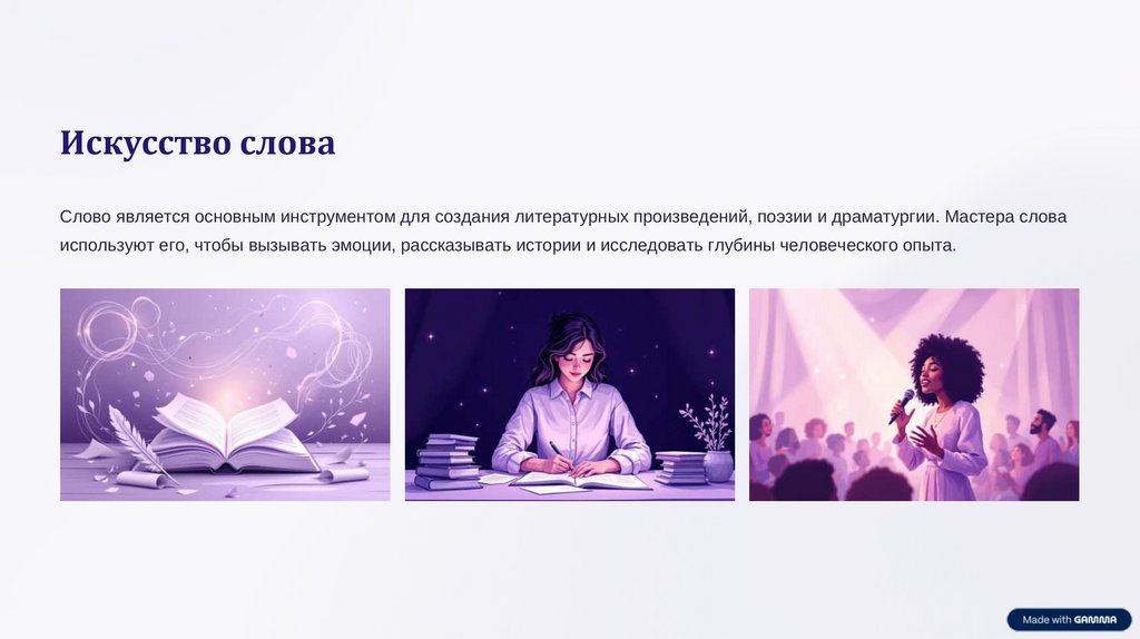 Искусство словаСлово является основным инструментом для создания литературных произведений, поэзии и драматургии. Мастера слова