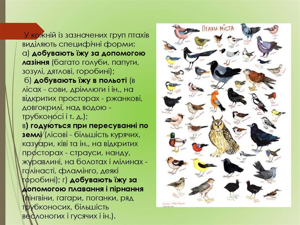 У кожній із зазначених груп птахіввиділяють специфічні форми: