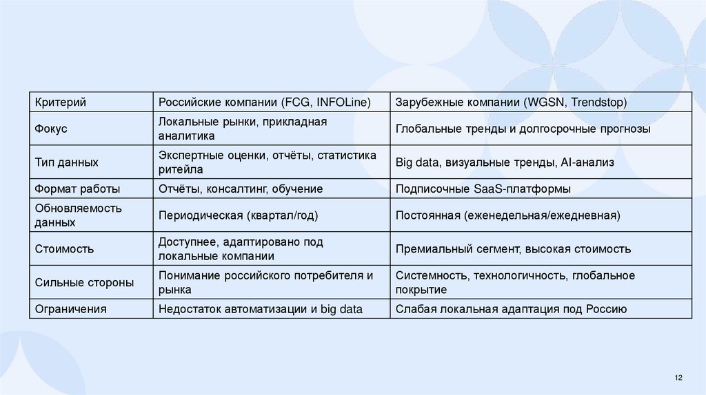 11. Сравнение российских агенств Fashion Consulting Group (FCG) и INFOLine с иностраннми агенствами WGSN и Trendstop